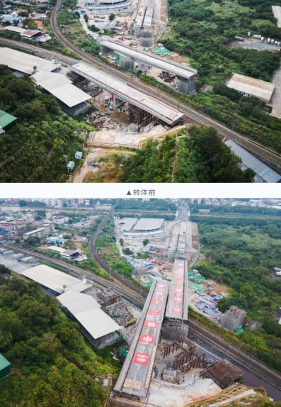 當(dāng)天7時(shí)04分,轉(zhuǎn)體橋梁開始轉(zhuǎn)體,經(jīng)過44分鐘施工,成功完成高空“二人轉(zhuǎn)”,為下一步順利實(shí)現(xiàn)通車運(yùn)營奠定堅(jiān)實(shí)基礎(chǔ)。轉(zhuǎn)體橋上跨既有漳龍線、龍東線及煤場專用線3條鐵路貨運(yùn)營業(yè)線,距離營業(yè)線最近距離僅5.9米,施工難度大,危險(xiǎn)系數(shù)高。