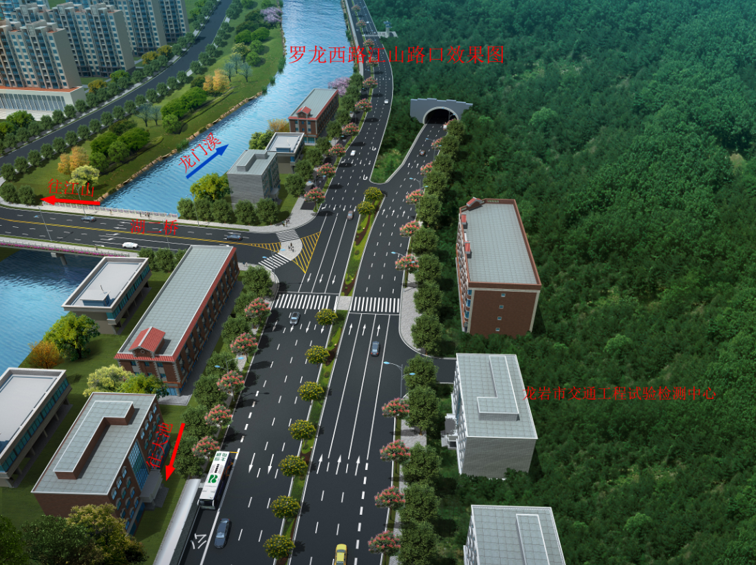 羅龍西路是連接龍巖西高速出入口與中心城市的唯一通道,其規(guī)劃改造范圍從紅竹山橋至御佳園路口,全長3855米,計劃將原道路拓寬至40米,實(shí)行雙向六車道,兩旁設(shè)2.5米非機(jī)動車道,并在湖二橋路口以東設(shè)640米入城單向三車道隧道連接至御佳園路口,原羅龍西路湖二橋至御佳園段將調(diào)整為出城單向車道。