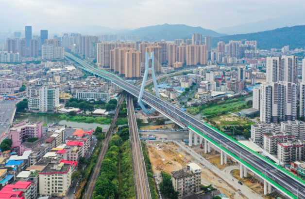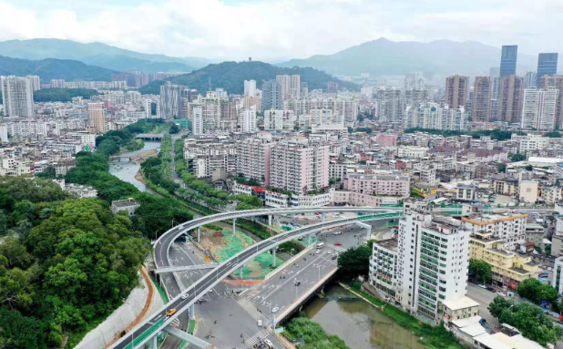 龍巖大道高架橋2013年9月開工建設(shè),2020年10月建成通車。該項目地面道路長3395米,寬78米;高架橋部分長2329米,標準段寬26米,含一座(190+150)米的獨塔雙索面斜拉橋,斜拉橋?qū)?4.2米;葫蘆溪分洪工程長667米,標準段結(jié)構(gòu)7.5×3.9米,總投資24億元。